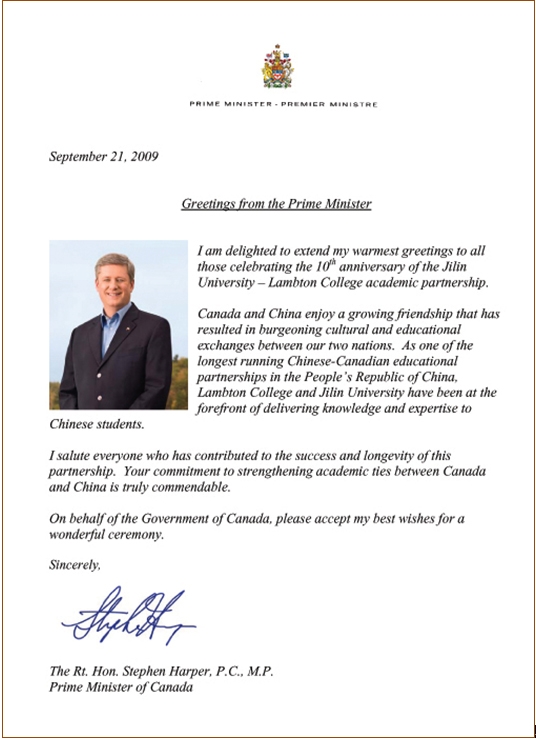 加拿大总理史蒂芬·哈珀致信祝贺我院建院十周年