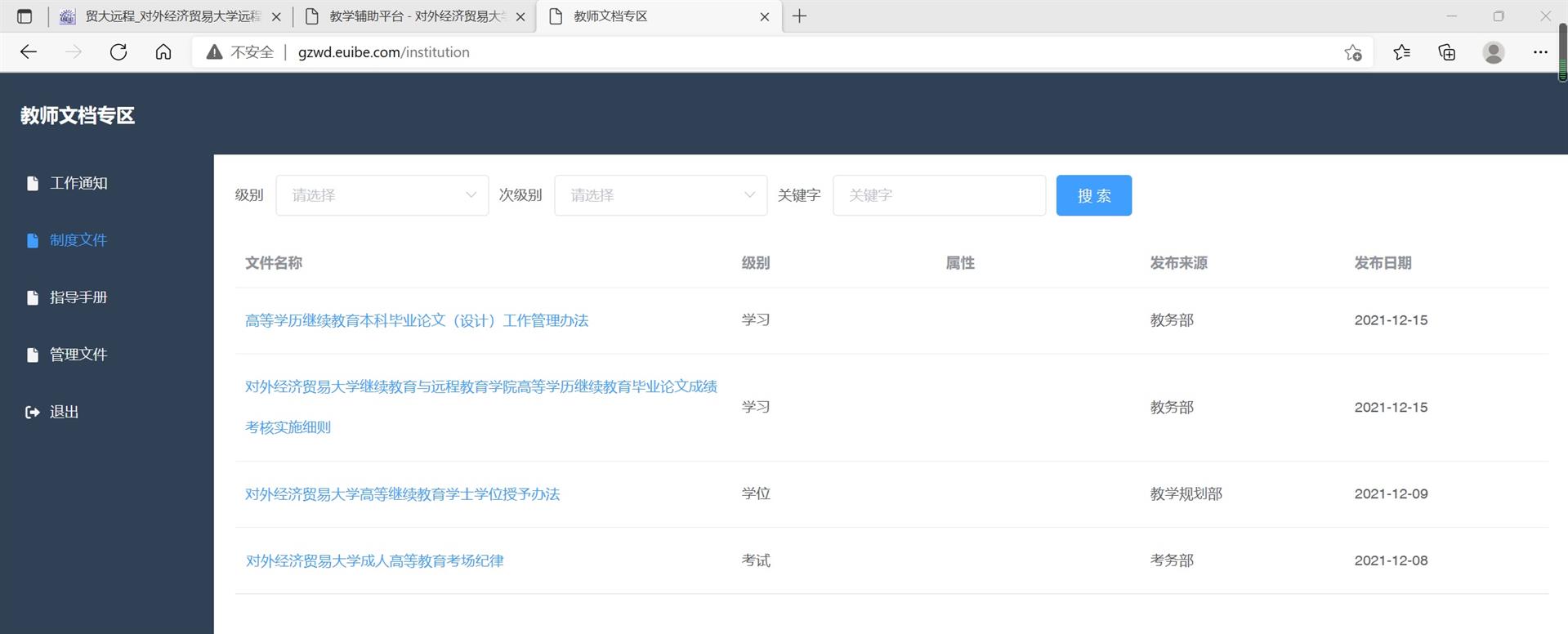 学院学历教育部门建立工作文档管理系统加强工作文件管理档系统的建设,经过学院质量会多次讨论,学院多个学历部门参与建议,由远程教育与函授教育部、在线课程研发部完成前期结构搭建工作,技术部、考务部完成最终的系统开发、测试、推广使用等工作,历时8个月建设完毕并投入使用。目前学历各部门可以将工作文件进行分类并上传,学习中心、教学站及在读学生可以根据需要进行查看。工作文档系统按照功能对工作文件进行划分,设有工作通知、制度文件、指导手册、管理文件四项二级子目录,并根据不同需求设置不同使用权限。日后,学院学历各部门将会根据实际工作需求,对工作文件进行规范并上传,供学院其他学历部门、各学习中心、教学站以及在读学生使用。