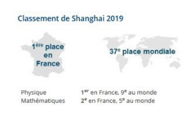 世界排名:用现在国际认可度最高的“世界大学学术排名”(Academic Ranking of World Universities), 简称ARWU排名。2019 ARWU 世界大学学术排名中综合排名位列法国第一,世界第37位;物理领域全法排名第一,世界第九;数学领域全法排名第二,世界第五;