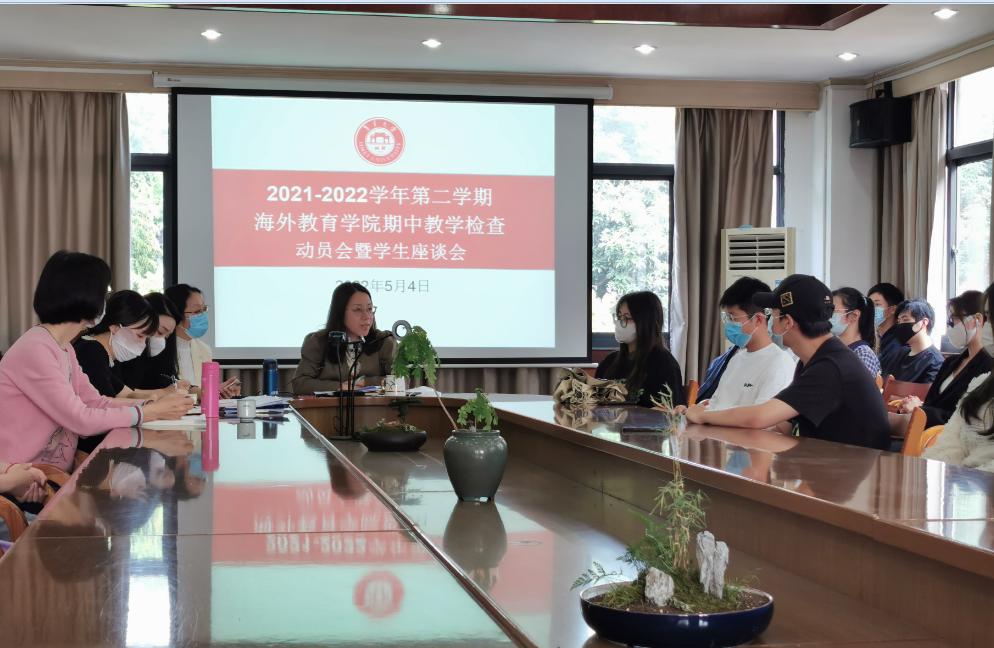 5月4日下午,海外教育学院召开2021—2022学年第二学期期中教学检查动员会暨学生座谈会。学院教学办公室人员、辅导员及中外学生代表以线上线下相结合的方式参加会议,会议由学院副院长陈辉主持。