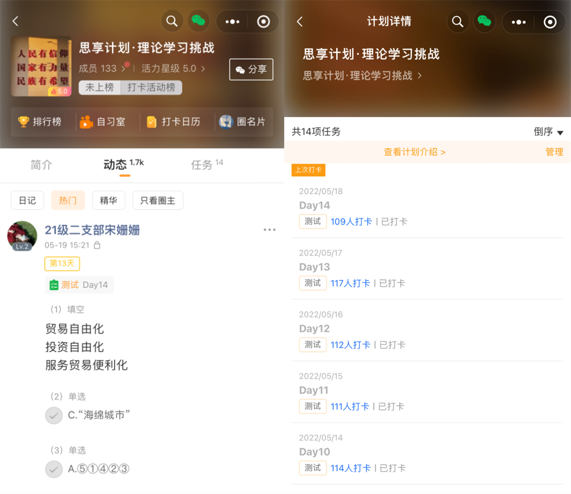 为认真贯彻落实习近平总书记关于党史学习教育的重要论述精神,营造良好的党史理论学习教育氛围,学习百年党史,汲取奋进力量,将红色基因融入血脉,民航学院组织各研究生党支部于2022年5月5日至18日推出“思享”计划·14天理论学习打卡活动,进一步提升党员们理论知识学习的主动性。