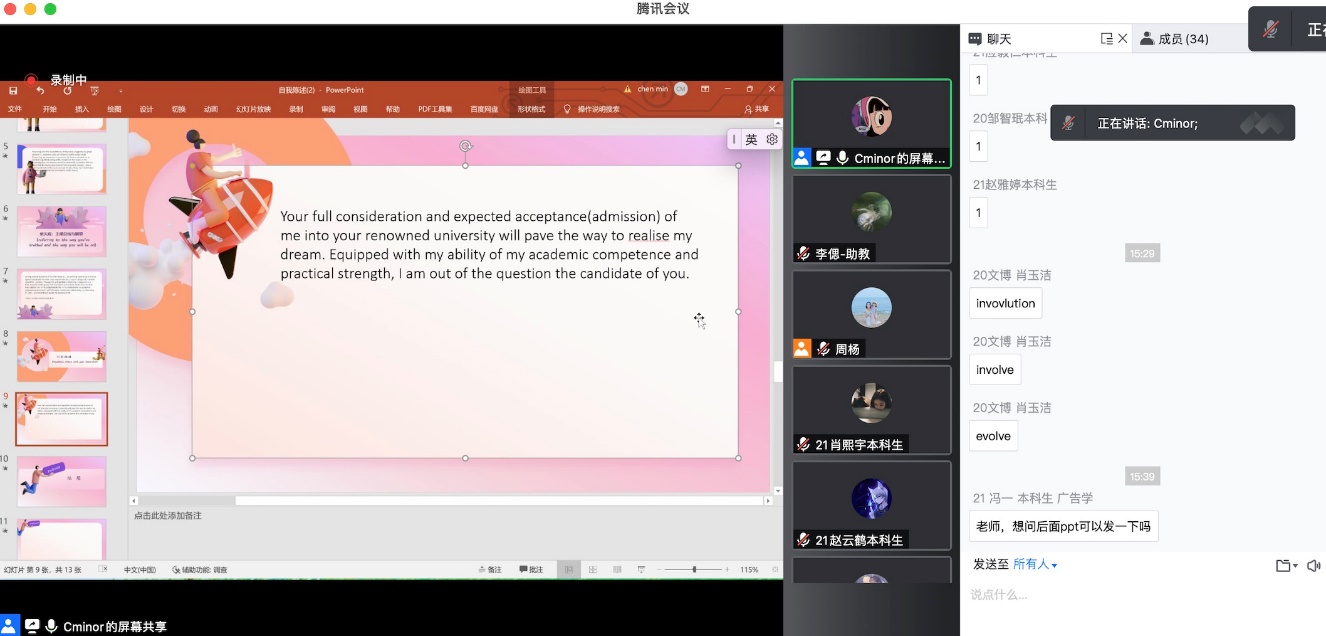 英语写作指导系列讲座是以提高同学们的英语写作水平而于本学期新开设的线上系列讲座。教学经验丰富的陈老师能够让同学们在轻松愉悦的课堂氛围里快速掌握并提升英语写作的有效方法,写出地道的英文篇章。