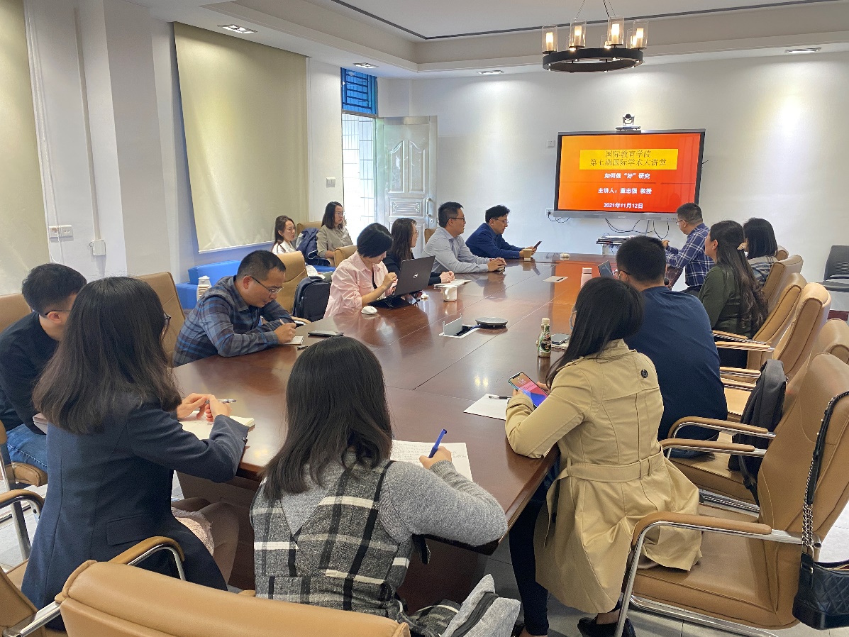 11月12日下午,为有效提升国际教育学院教师的教学和科研水平,活跃学术氛围,国际教育学院举办第七期国际学术大讲堂活动,邀请华南师范大学董志强教授作了题为《如何做“好”研究》的学术讲座。副校长易行健、国际教育学院负责人、全体教师参加了讲座。易行健主持讲座。
